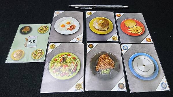 棄掉展示的手牌並完成的餐桌牌收下來作為得分(上面的小費)