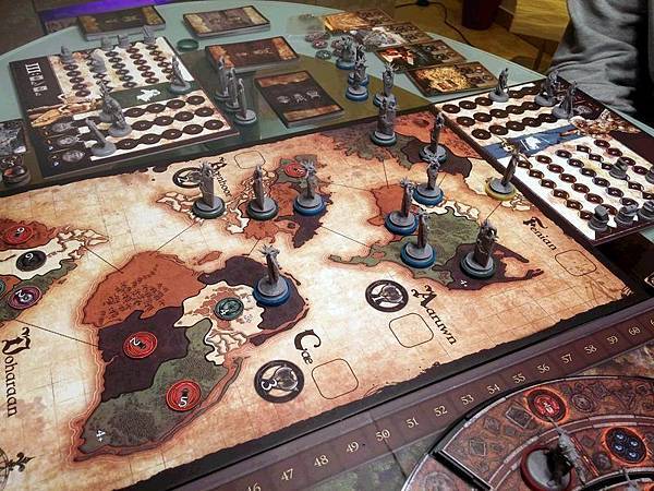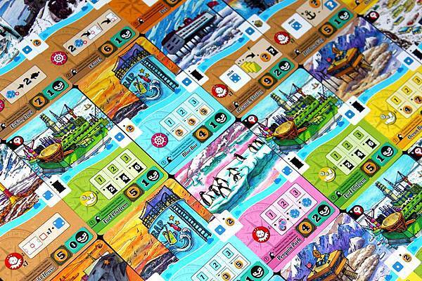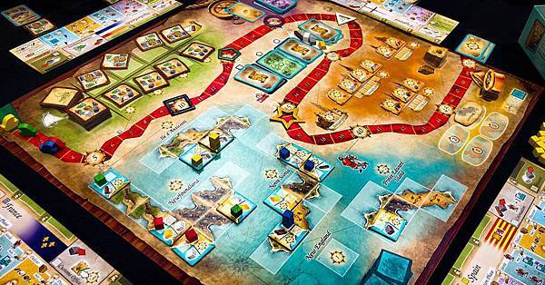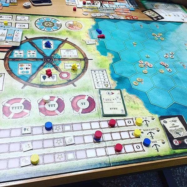 遊戲很特別的把計分軌橫跨在主圖板中間,在視覺上讓四散的各區塊看起來沒有那麼突兀,而且讓計分軌上獎勵移動的機制獲得更多的注目。但可惜獎勵移動的機制並沒有給落後者補償,只是看起來有而已XD,還是要在早期先衝過去拿獎勵才是王道,落後真的很難追。遊戲比較可惜的是國家能力跟船長的不平衡,先拿獎勵的先選會更擴大這個差距,如果你不是前兩名拿到船長獎勵的玩家,那你九成會輸掉,果然三歲定終身啊XD。