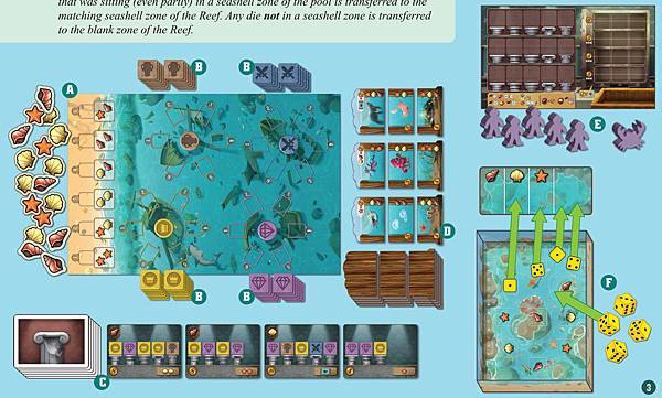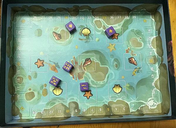 若輪到你的回合時礁石圖板上沒骰子了,就把骰子搜集起來一次丟到骰盤裡,再根據骰子有沒有壓到貝殼的方格決定要把骰子移到礁石圖板的那個區域(有一小部分壓到就算有喔!)。
