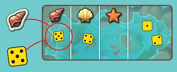 上圖為例,從海螺那區拿1顆骰子並獲得1個海螺作獎勵。