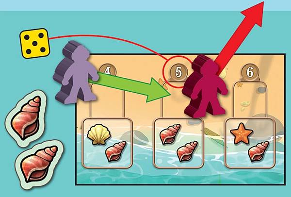 上圖為例,骰子點數是5,把在5那格的紅色潛水夫趕回去並獲得2個海螺