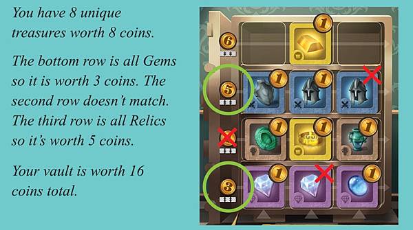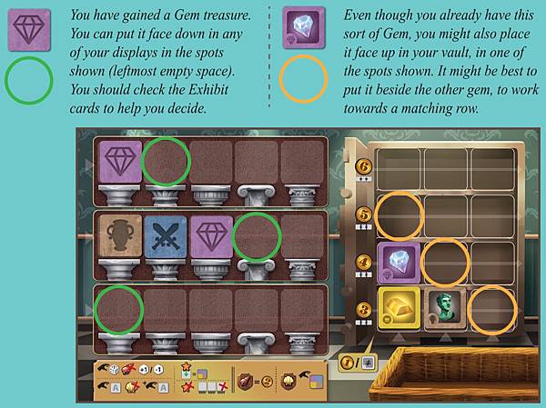 玩家獲得寶藏後可翻面查看,然後決定寶藏要放在展覽室還是保險箱裡。