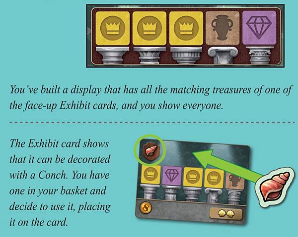 若你某一個展覽室裡的寶藏類型有符合展覽卡條件的話,就可以拿取該展覽卡放在圖板旁得分。