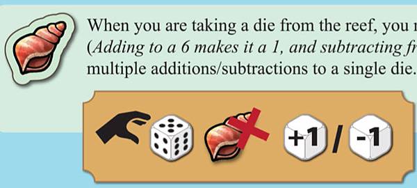 拿取骰子時,可以棄掉海螺讓骰子點數+/-1,可以棄掉多個海螺讓骰子點數大量改變。