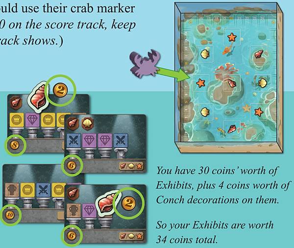 分數分為展覽、保險箱跟水族箱三個部分,可以拿螃蟹到分數軌計分喔(超沒用的...)。